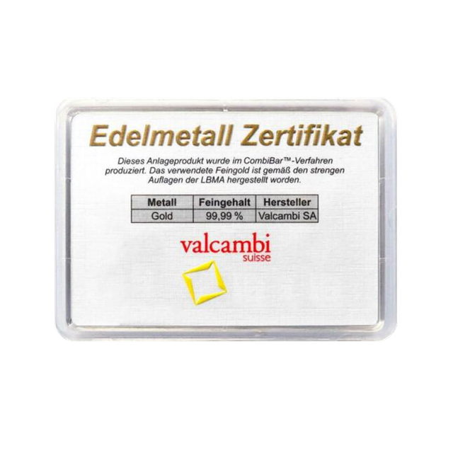 5 x 1 gram goud met certificaat. Dit product bestaat uit een reep van 5x 1gram goud (24 karaat) van de Zwitserse firma